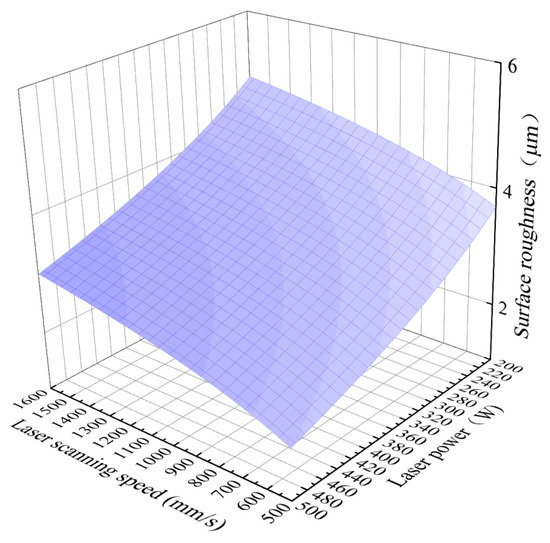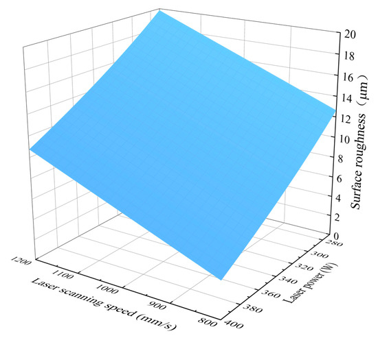 where a is the laser scanning speed (mm/s), and b is the laser power (W). The image of the equation is shown in Figure 8. According to the established equation, the surface roughness is proportional to laser scanning speed and inversely proportional to laser power, suggesting that the higher the laser power, the lower the scanning speed, the lower the surface roughness, and the better the surface performance of the printed sample. This is consistent with previous experimental findings that surface roughness is inversely proportional to laser energy density.