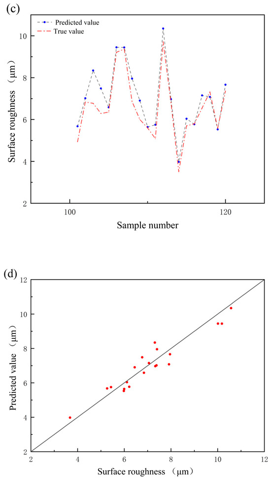 Comparison of surface roughness prediction results given by 2D RF: (a,b) are the predicted surface roughness values for the training set; (c,d) are the predicted surface roughness values for the test set.