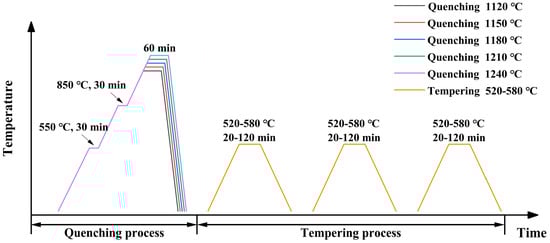 As shown in Figure 1, the heat treatment of H-HSS is carried out in a tube furnace under an argon atmosphere, with a heating rate of 5 °C/min to 550 °C for 30 min, then to 850 °C for 30 min, and then to continue heating to a temperature range of 1120~1250 °C for 1 h. Subsequently, the sample in the high-temperature state was taken out by iron pliers and quickly cooled in the U8101 ordinary quenching oil (quenched hot isostatic pressed powder metallurgy high-speed steel, Q-HSS). The kinematic viscosity of the U8101 ordinary quenching oil is 25 mm2/s, with a flash point of 220 °C and an ignition point of 245 °C. The Q-HSS was immediately tempered and heated at a heating rate of 5 °C/min to 520 °C, 550 °C, or 580 °C, with holding times of 20 min, 40 min, 60 min, 90 min, or 120 min, respectively. Cross experiments were set up, and the tempered samples were cooled to room temperature in the furnace to obtain the final samples (tempered hot isostatic pressed powder metallurgy high-speed steel, T-HSS).