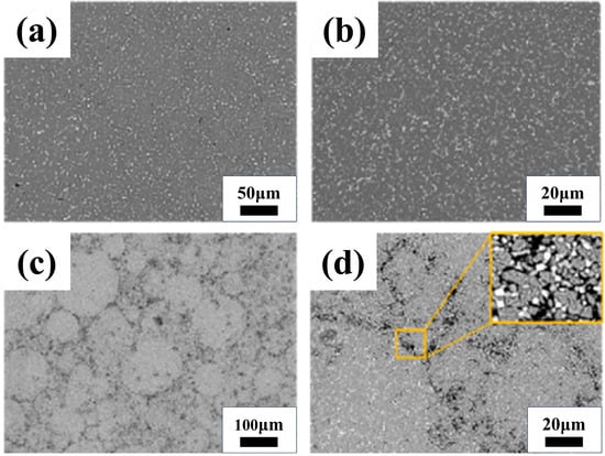 The FESEM images of the H-HSS sample are displayed in Figure 2. It can be observed from Figure 2a,b that the minority pores are presented in the H-HSS sample, accompanied by white particle precipitation and uniform dispersion. The measured density of the H-HSS sample is 8.15 g/cm3, which reaches 99% of the theoretical density and is not fully dense. Figure 2c,d show the FESEM images of the H-HSS sample after etching. As can be seen, the H-HSS sample presents the obvious characteristics of the powder prior to the particle boundary, where pores appear at the boundaries of the powder particles, which are attributed to the carbon deoxidation reaction occurring in the HSS powder during high-temperature sintering. During the high-temperature sintering process, when a certain temperature is reached, the carbon atoms will undergo an oxidation–reduction reaction with metal oxides in the powder, producing CO/CO2 gas. However, hot isostatic pressing sintering is a sealed process, and the generated gas cannot be eliminated; thus it will gather at the boundaries of the powder particles to form pores. In addition, during the hot isostatic pressing process, due to the effect of surface tension, the excess vacancy concentration is generated at the sintering neck, which provides dynamic conditions for atomic diffusion, allowing strong carbide-forming elements in the powder to diffuse to the surface. The pre-existing oxide on the particle surface and the interface between particles provide structural conditions for carbide nucleation, thereby precipitating a stable layer of carbide on the particle surface and outlining the original morphology of the powder. The presence of pores and carbides weakens the binding force at the boundaries of powder particles, making them more vulnerable to erosion or fracture. Therefore, controlling the oxygen content in the powder and forming process will be the key to avoiding the prior particle boundary and obtaining the high-density sample.