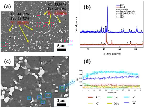 The phase analysis results of the H-HSS sample are presented in Figure 3. It can be observed in Figure 3a,c that the bright white and dark gray particles with irregular morphology are uniformly distributed at the grain boundaries and grain interior in the H-HSS sample. The particle size at the grain boundary is relatively large, approximately between 1 and 3 μm, while the particles inside the grain are smaller than 1 μm. This may be attributed to the disordered atomic distribution and high energy at the grain boundary, which make it easier to become a site for non-uniform nucleation during solid-state transformation. Therefore, the carbides at the grain boundary precipitate first and are easier to grow, while the carbides inside the grains are limited by the surrounding grains when they begin to precipitate under a concentration gradient, making them difficult to grow. The composition testing of bright white and dark gray particles in the sample showed that the main components of bright white carbides were C, Fe, and W elements, which may be tungsten carbides. The main components of dark gray carbides were C, Fe, and V elements, which may be vanadium carbides. The XRD patterns of the powder and H-HSS sample are displayed in Figure 3b. It is noted that the main diffraction peaks in the powder are the austenite- and MC-type carbides, while a small amount of diffraction peaks of ferrite-, martensite-, and M2C-type carbides are detected. The main diffraction peaks in the H-HSS sample are the ferrite- and M6C-type carbides, with a small number of diffraction peaks of MC-type carbides detected. The result may be attributed to the favorable equilibrium transformation of the matrix structure during the HIP process, where austenite undergoes eutectoid transformation and generates low-temperature ferrite. The metastable M2C-type carbides decompose and transform into more stable M6C-type carbides and MC-type carbides. In addition, as can be observed in Figure 3c, the dark gray carbide particles exhibit a core–shell structure. The EDS analysis results are shown in Figure 3d. It can be seen that the elements W, Mo, Cr, and C remain unchanged, while the element V first increases and then decreases, and the element Fe first decreases and then increases, suggesting that the core–shell structure is rich in the element V on the inside and iron on the outside.