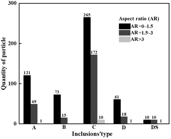The type, size, and quantity of the inclusions in the H-HSS sample are listed in Table 2. It can be noticed that all five types of inclusions are distributed in the sample, among which type C has the highest number of inclusions, followed by type A, with fewer types of B, D, and DS. In addition, the size of most inclusions is below 2 μm, accounting for 85.87%. The number of large-sized inclusions is relatively small; for example, the proportion of inclusions in the range of 2 to 5 μm is only 10.41%, and the proportion of inclusions in the range of 5 to 13 μ m is only 1.12%. The size of DS-type inclusions is generally larger, with a size greater than 13 μm, and the quantity is relatively small, accounting for only 2.6%. Figure 4 displays the morphological distribution of the inclusions in the H-HSS sample. As can be seen, most of the various types of inclusions exist as spherical or near-spherical particles with aspect ratios less than 1.5, followed by ellipsoidal particles with aspect ratios between 1.5 and 3, and a few inclusions with aspect ratios greater than 3. Non-metallic inclusions are common in all steels and have important effects on the properties. When the inclusions are circular with an aspect ratio of 1 and have a good interface connection with the matrix, the influence of inclusions on the stress distribution at the interface of the material can be ignored when the inclusions are located in the grain interior, the grain boundary, or the outer surface of the material [31,32]. Therefore, the results indicate that the overall morphology distribution of inclusions is regular, mostly spherical, and its effect on mechanical properties can be ignored. The bending strength and hardness of the H-HSS sample are 3112 MPa and 56.3 HRC, respectively.