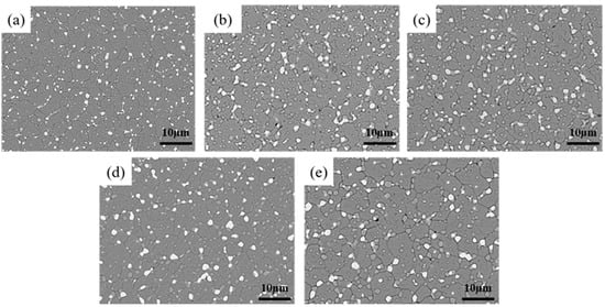 FESEM images of the Q-HSS sample with different temperatures: (a) 1120 °C, (b) 1150 °C, (c) 1180 °C, (d) 1210 °C, and (e) 1240 °C.