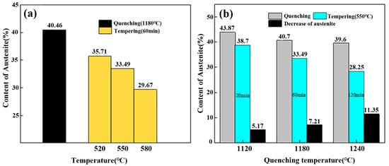 The residual austenite content in the sample varies with different quenching temperatures, tempering temperatures and time. (a) quenching and different tempering temperatures (b) quenching and different tempering time.