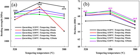 Curves of the bending strength (a) and hardness (b) of the T-HSS sample vary with different quenching temperatures, tempering temperatures, and time.
