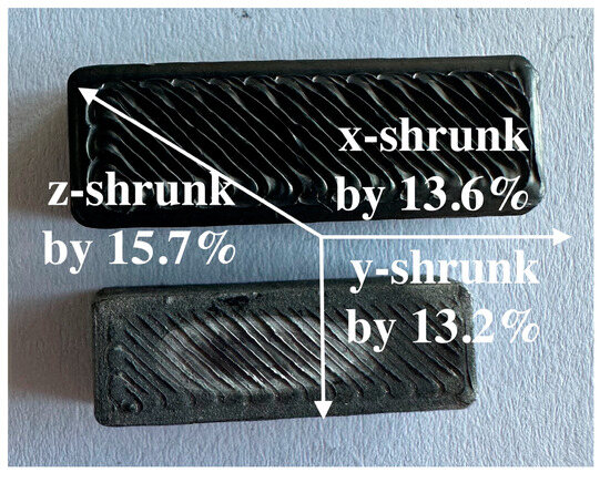 - The complex gradient structure was built using PEM at 165 °C with a layer height of 200 μm and a printing direction of 45°. The water-soluble polymer component can be effectively dissolved, and specimen size, debinding temperature, and time significantly influence the debinding rate. The density of sintered parts is 97.13% of the theoretical full density obtained at 1500 °C for 1.5 h, with the highest shrinkage (15.7%) occurring along the layer direction.