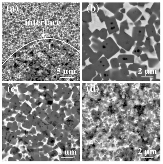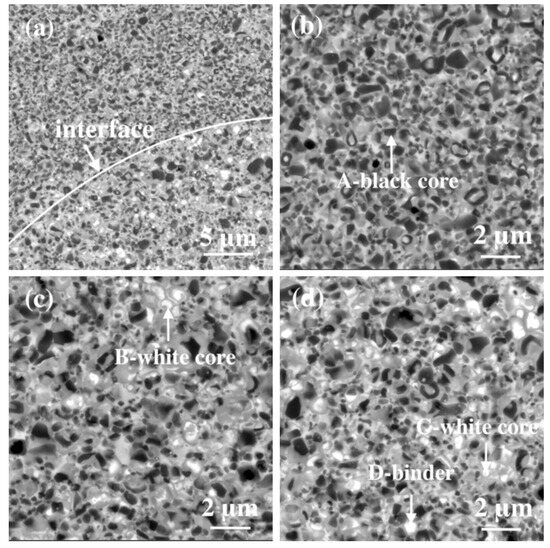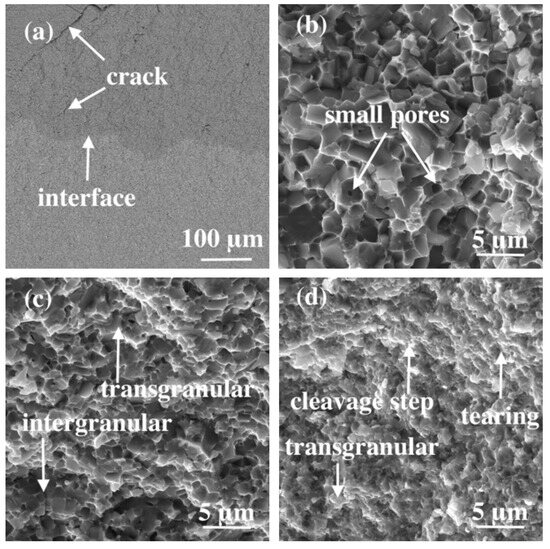 - A black core–gray rim structure transforms into a white core–gray rim structure as the Co and Ni binder phase content increases in the gradient cermets. The crack propagation and initiation path changes at the gradient interface, as the gradient layer with more binder phase has good plastic deformation ability and can absorb more crack propagation energy to close the crack. The fracture exhibits three fracture behaviors, which are tearing of the binder and intergranular and transgranular fracture.