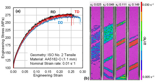 (a) Repeated engineering stress–strain curves of AA5182-O (1.1 mm) in the rolling (RD), diagonal (DD), and transverse (TD) sheet directions. Major true strain-rate contours from the gauge region of an RD tensile sample are presented in (b) for applied tensile strains varying from 0.025 to 0.149 true strain. The strain-rate contours highlight the PLC effect in the material and result in the serrated flow observed in (a). At an applied tensile strain of 0.111, PLC bands are observed in the tensile shoulder, outside of the uniform gauge region.