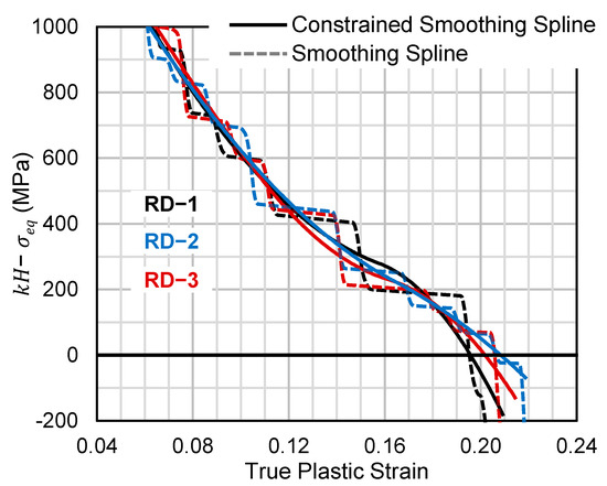 The difference between the uniaxial work hardening rate (k = 1) and the flow stress, Equation (1), is plotted for each repeated tensile test in the rolling direction. The repeated curves were pre-conditioned with a monotonically decreasing constrained smoothing spline prior to evaluation. The same curves without the constraint are also shown.
