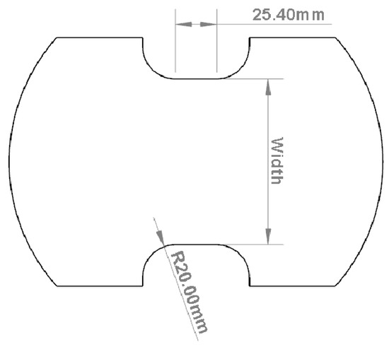 All formability testing was conducted using dog-bone (DB)-type specimens in accordance with the ISO12004-2:2008 standard [13], with a 25.4 mm long gauge section and a 20 mm transition radius, and various widths, as shown in Figure 3 and summarized in Table 1. In the Marciniak and Nakazima testing, the specimen widths ranged from 25.4 mm to 177.8 mm to produce strain paths from uniaxial to biaxial stretching. Three repeated tests were completed per specimen width. For stretch–bend testing, only a 76.2 mm wide specimen was utilized which produced approximately plane strain bending and stretching. For each sample type, if fracture did not occur within the gauge region, additional tests were performed. All tests were performed in an MTS formability press with a constant punch velocity of 1 mm/s and binder load of 640 kN to limit draw-in. Lubrication in all testing consisted of placing three to four layers of 0.125 mm thick PTFE sheet between the punch and the DB samples. Both sides of each PTFE sheet were lightly coated in white petroleum jelly. The combination of PTFE sheets and white petroleum jelly was found to provide adequate lubrication during testing as evidenced by occurrence of necking near the center of the Nakazima punch.