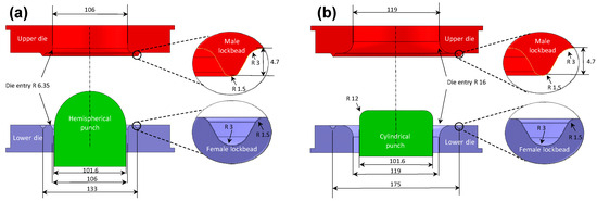 Schematic of the (a) Nakazima and (b) Marciniak tools that conform to the ISO12004-2 standard [13]. All dimensions are in millimeters.