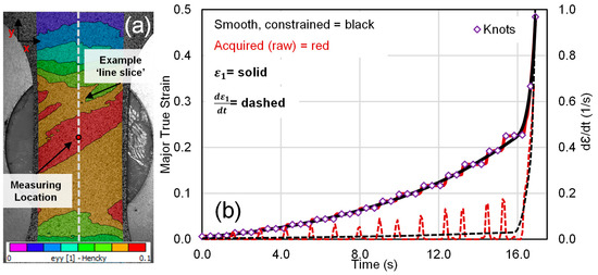 The constrained splines were fit using the open-source toolbox SLM, of D’Errico [49] in Matlab® (R2021b). Constraints upon the derivatives of the splines were enforced to ensure that the spline has a physically realistic trend for the parameter of interest. For instance, the major strain at the crack location must always be positive and increasing in formability characterization tests. The same holds for the major strain-rate, as shown in Figure 5b). To monitor the underlying trend in the major strain to detect localization, the fluctuations in the strain-rate due to PLC effects can be minimized by enforcing the spline to be positive and continuously increasing.
