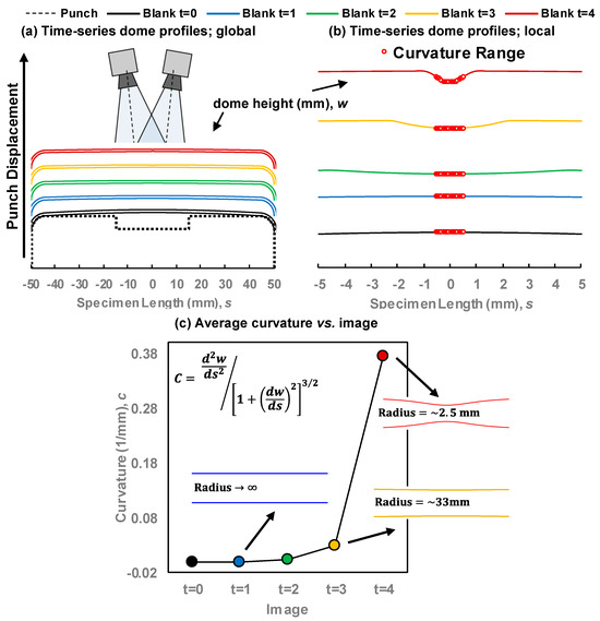 In the curvature approach to limit strain detection, stereoscopic DIC is used to optically detect the development and growth of a localized neck in terms of a surface discontinuity. This method is analogous to the so-called finger test, employed in the early days of FLC development [4] where necking was determined by the touch of a fingernail over the surface of interrupted forming limit tests. An illustrated example is shown in Figure 6 to show the changes in curvature over the duration of a formability test. Figure 6a–c shows a conceptual evolution of the necking profile on the surface of a Marciniak sample during forming. Prior to necking, the curvature is relatively constant and close to zero, corresponding to uniform stretching of a nominally flat sheet. At the onset of localized necking, the curvature signal rapidly changes as a physical groove, i.e., acute neck, develops. The limit strains correspond to the sudden change in curvature relative to the baseline signal.