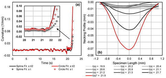 (a) Comparison of calculated curvature evolution in a plane strain Marciniak test sample, as calculated using either a quintic smoothing spline or using a circle fit over ranges of 1.1 mm and 2.2 mm. The necking profiles at different instances in time at and after the onset of necking are included in (b), with the red curve corresponding to the profile from the image just prior to failure.