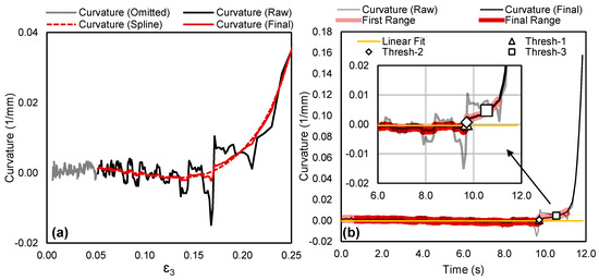 Smoothing of the curvature signal, , from Figure 7a was performed by considering curvature as a function of thinning strain at the center of the neck, , as illustrated in Figure 8a. Here, the thinning strain, , versus time is first smoothed using the same procedures applied in Figure 5b. When curvature is plotted with respect to the thinning surface strain, the transition at necking onset can be more easily fit with a spline fit since is also accelerating, producing a more gradual transition.