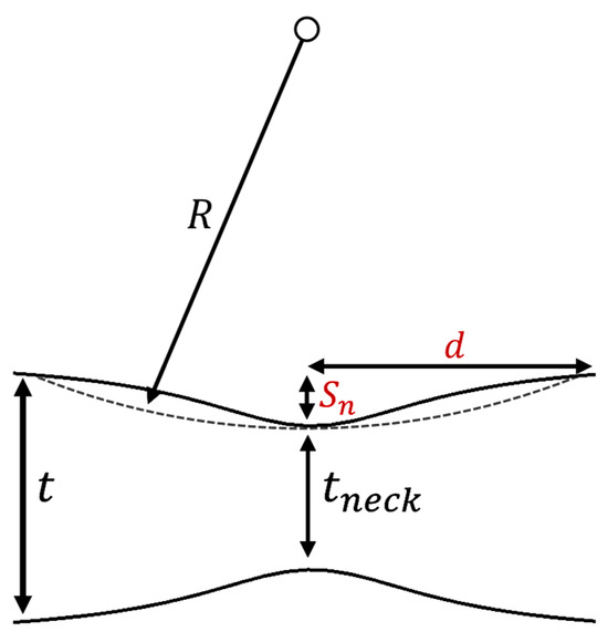 The neck depth, , is derived from a geometric approximation of the neck, assuming a constant necking radius of curvature for a given curvature threshold, as represented in Figure 9. The neck depth is computed using Equation (7) from the measured curvature, where is the reciprocal of the measured curvature at a given threshold, and is one-half of the neck width.