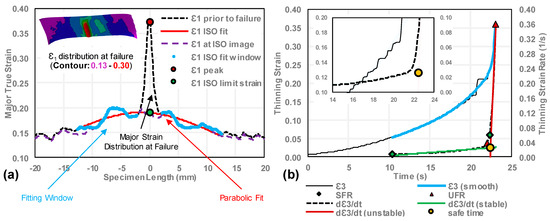 In the current implementation, the thinning strain rate is computed by first fitting a constrained spline to the thinning strain vs. time at the failure location. As with the ECM, the first 0.05 thinning strain of the test is omitted in the analysis to avoid spurious effects induced by initial bending in the Nakazima and stretch–bend tests. Constraints on the spline consistent with the strain history associated with localization require the first and second time-derivatives to be positive, which serves to fit through the PLC-affected strain-time series data. It is then straightforward to obtain the time-derivative for the thinning strain-rate. The stable strain-rate fitting range (SFR) is established based on the median strain-rate of the test, bounded by twice the median absolute deviation, as shown in Figure 10b. The unstable strain-rate fitting range (UFR) is taken from the points beyond the SFR. Once the ranges are established, linear regression is performed to establish the stable and unstable line fits, after which the intersection of the lines is found. The DIC image corresponding most closely to, but not exceeding, the intersection time is identified as the safe image, from which the principal strains are taken as the limit strains for the test.