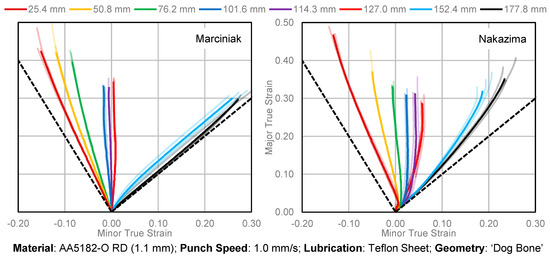 The strain paths for all Nakazima and Marciniak tests are presented in Figure 11 with generally good repeatability for all sample widths.