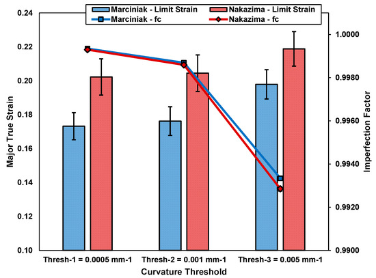Applying Equation (6) to the plane strain example in Figure 7 and Figure 8 for the curvature thresholds of 0.0005 mm−1, 0.001 mm−1, and 0.005 mm−1, the corresponding values were calculated to be 0.9993, 0.9987, and 0.9933, for major limit strains of 0.168, 0.169, and 0.188. It is interesting to note that the curvature imperfection factor, , is of the same form as the initial thickness imperfection factor used in MK forming limit predictions [10]. Importantly, the reported imperfection in the current work is the result of the onset of necking as opposed to initial thickness surface imperfections, as in the case of the MK imperfection factor. In this way, the curvature imperfection factor, , acts as a tolerance for necking detection, as opposed to characterizing an initial defect that triggers necking.