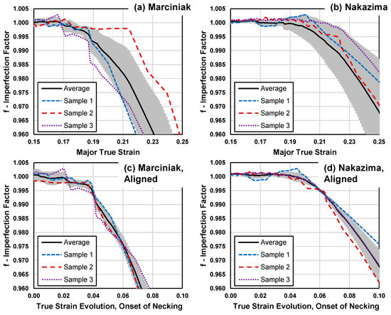 Plot of imperfection factor as a function of applied strain. Results from three (of nine) repeat tests are plotted for each case, along with the average response (black curve) and 99% confidence intervals (shaded) for (a) AA5182-O tested with a Marciniak punch for plane strain samples (101.6 mm–127.0 mm), (b) AA5182-O tested with a Nakazima punch for plane strain samples (101.6 mm–127.0 mm). In (c,d), the individual and mean curves have been corrected to account for variability at the onset of necking by shifting all curves in the strain domain such that the individual curves overlap with the mean curves at strains corresponding to , the 0.005 mm−1 curvature threshold. The resulting curves are plotted (zeroed) as onset of necking strains.