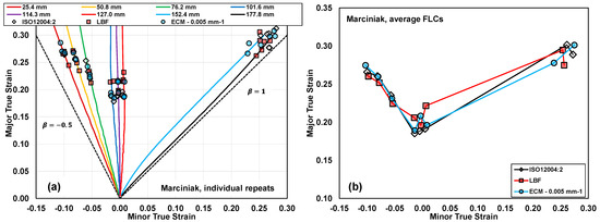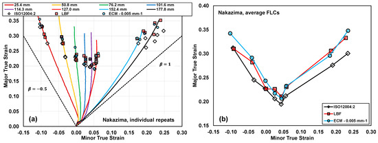 The Nakazima limit strains obtained using each limit strain detection technique are shown in Figure 16a, with corresponding average strain paths. The corresponding average limit strains for each specimen geometry and detection method and forming limit curves are plotted in Figure 16b, while the numeric values are summarized in Table 3, along with 95% confidence intervals. In the geometries ranging from 101.6 mm to 127.0 mm, the average major limit strains are 0.219, 0.204, and 0.222 for the ECM, ISO, and LBF methods, respectively. Thus, the same ordering in-plane strain formability under Marciniak testing is preserved in the Nakazima testing; however, the differences in LBF and ECM here are within the 95% error bands of the measurements. The ECM imperfection factors are similar to the Marciniak tests for these geometries with for Marciniak and for Nakazima, on average.