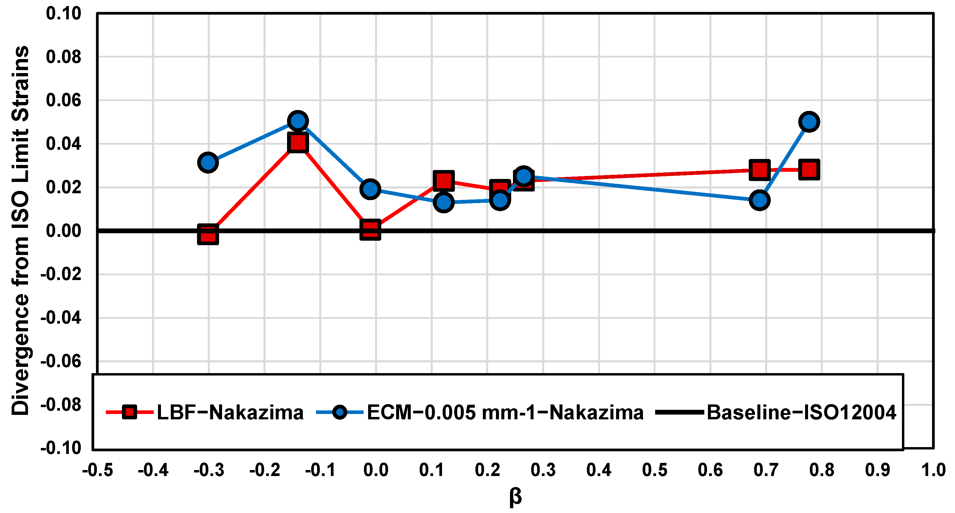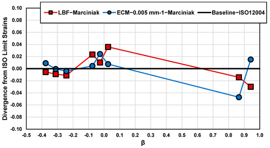 Difference in von Mises equivalent limit strains between the LBF and ECM methods relative to the ISO12004-2 baseline as a function of strain path for Marciniak tested samples. Here, the strain path is characterized by , where and are the average minor and major ISO strain limits.