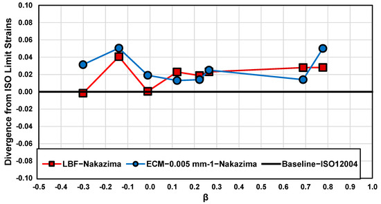 Differences in von Mises equivalent limit strains between the LBF and ECM methods relative to the ISO12004-2 baseline as a function of strain path for Nakazima tested samples. Here, the strain path is characterized by , where and are the average minor and major strain limits for each geometry plotted in Figure 16, as determined using the ISO12004-2:2008 standard [13].