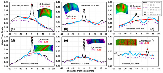On average, the LBF and ECM (upper) limit strain detection schemes predict von Mises equivalent limit strains that are 6.3% and 8.5% higher than the ISO method, respectively, as seen in Figure 17. On average, the three limit strain detection schemes were within 2% of one another for the Marcinak tests. However, there were significant differences between the detection schemes for some of the Nakazima sample widths. It is possible that the local approaches were less influenced by the occurrence of multiple necks when compared to the ISO standard. Figure 18 highlights typical Nakazima and Marciniak strain distributions at failure with the ISO fitting approach applied for geometry widths of 50.8 mm, 127.0 mm, and 177.8 mm. Single necks or a prominent primary neck with a mild secondary neck are evident for the Marciniak tests in Figure 18d–f with corresponding ISO parabolic fits. In Nakazima testing, the significant double necks shown in Figure 18a–c can skew the parabolic fitting process of the ISO method, which is noted as problematic within the ISO12004-2 standard [13] and can lead to the minor limit strain not laying upon the measured local strain path, as shown in Figure 16. Consequently, the double necking in the Nakazima tests serves to produce conservative limit strains. By contrast, the local LBF and ECM do not rely on the global strain distribution for their applications.