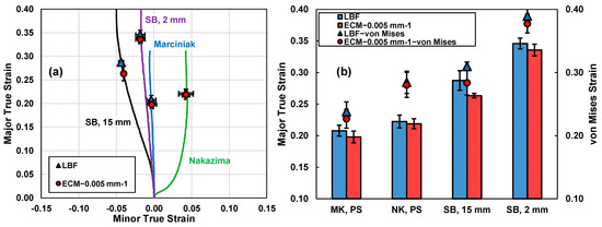 The LBF and ECM limit strain detection schemes are applied to the analysis of a 76.2 mm dog-bone specimen subjected to stretch–bending (SB) with 15 mm and 2 mm radius cylindrical punches. Representative strain paths from each punch are included in Figure 19a, as well as reference strain paths for 127.0 mm width geometries from Nakazima and Marciniak testing. The intention here is to (i) quantify plane strain formability under severe through-thickness strain gradients and (ii) to evaluate the relative performance of each methodology. From Figure 19a, it is evident that the 2 mm stretch–bend punch produces a strain path that is very close to plane strain and aligns rather closely to the in-plane Marciniak plane strain path. Conversely, the 15 mm punch shows a strain path slightly shifted towards uniaxial stretching.