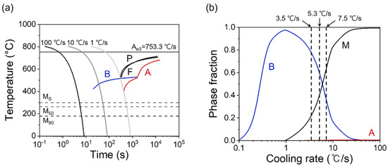 (a) Continuous cooling transformation (CCT) diagram of the investigated steels (M, martensite; B, bainite; A, austenite; F, ferrite; P, pearlite) and (b) the phase fraction plotted as a function of different cooling rates of 3.5 °C/s, 5.3 °C/s, and 7.5 °C/s. Both phase diagrams were calculated by thermodynamic calculation software.