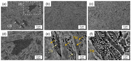 SEM micrographs of the steels under different cooling rates of (a) 3.5 °C/s, (b) 5.3 °C/s, and (c) 7.5 °C/s. (d) Magnified view showing coalesced bainite (CB) in the white dotted box for the (a) micrograph. (e,f) Electron channeling contrast imaging (ECCI) micrographs for the steels with a cooling rate of 3.5 °C/s. TB refers to tempered bainite, and TM indicates tempered martensite.