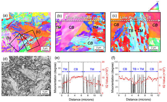 (a–c) Inverse pole figure (IPF) and (d) image quality (IQ) maps obtained from electron backscatter diffraction (EBSD) results for the steels with a cooling rate of 3.5 °C/s. The (b,c) IPF maps magnified in the (a) IPF map (TM; tempered martensite, CB; coalesced bainite, TB; tempered bainite). The (e,f) misorientation and image quality (IQ) value distributions of coalesced bainite (CB) relative to surrounding microstructures, which are profiled along blue arrows in (b) and (c), respectively.