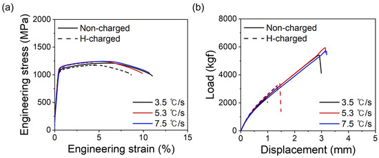 Slow strain rate test (SSRT) results of non-charged and H-charged tensile specimens for the (a) smooth and (b) notch for the steels under different cooling rates of 3.5 °C/s, 5.3 °C/s, and 7.5 °C/s.