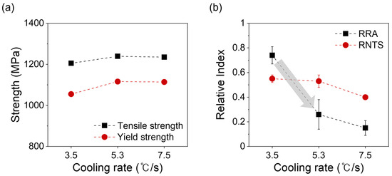 (a) Variations of tensile properties and (b) relative index of hydrogen embrittlement resistance measured from the slow strain rate test (SSRT) results for the steels under different cooling rates of 3.5 °C/s, 5.3 °C/s, and 7.5 °C/s.