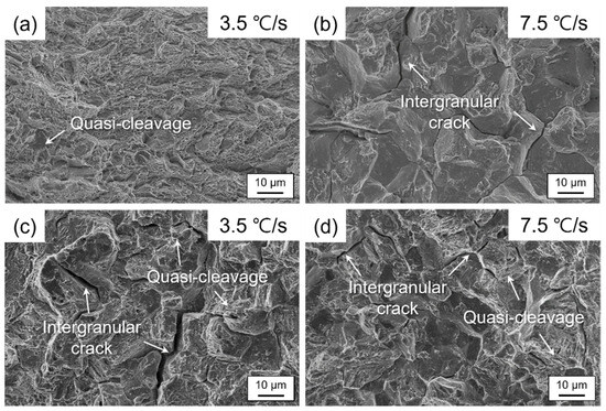 SEM fractographs of the H-charged tensile specimens of (a,b) smooth and (c,d) notch for the steels under different cooling rates of (a,c) 3.5 °C/s and (b,d) 7.5 °C/s.