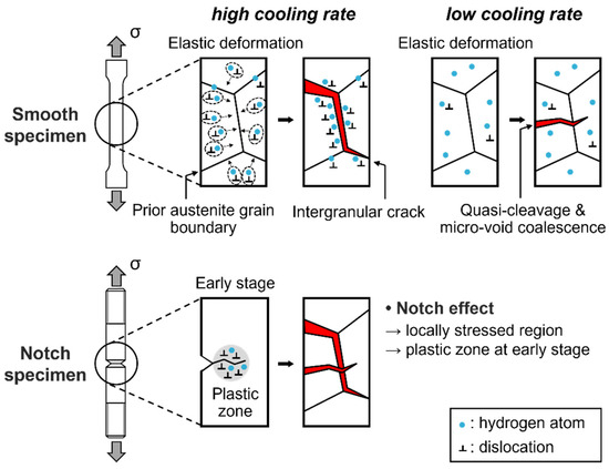 Figure 8 presents schematics showing the differences in hydrogen embrittlement behavior according to specimen geometry. For smooth specimens under tensile deformation, hydrogen atoms could migrate along dislocations and accumulate at prior austenite grain boundaries in the elastic region before yielding [21]. Hydrogen atoms accumulated at prior austenite grain boundaries can cause premature fracture through the HEDE mechanism, making the steel highly vulnerable to hydrogen embrittlement when dislocations are not sufficiently released. In smooth specimens with a high fraction of tempered martensite and high dislocation density, intergranular fractures became dominant, as shown in Figure 7b. However, hydrogen atoms became immobile in the coalesced bainite due to their large area and the relatively low dislocation density (Figure 2f), resulting in weak accumulation at prior austenite grain boundaries. This enables the smooth specimen with low cooling rates to become sufficiently elongated until it fractured in a transgranular mode consisting of dimples and quasi-cleavage, as shown in Figure 7a. Therefore, the RRA was greatly changed as the cooling rate increased from 3.5 °C/s to 5.3 °C/s. Accordingly, we could conclude that the formation of coalesced bainite contributed to an increase in the hydrogen embrittlement resistance of tempered martensitic steels. Interestingly, the differences in the fracture modes resulting from the cooling rate disappeared for the notch specimens. When the notch introduced triaxial stress and generated highly local stressed regions, dislocation pile-ups at the notch accelerated crack initiation at a very early stage of deformation. Because the stress concentration at the notch was dominant from the initial deformation stage, a similar fracture morphology occurred even though the initial dislocation density changed the hydrogen embrittlement resistance of the tempered martensite.