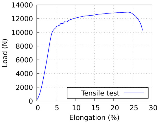 The mechanical behavior of the material was characterized through uniaxial tensile tests conducted on wire rods with an initial length of 220 mm using a Zwick–Roell universal testing machine (ZwickRoell, Ulm, Alemania) with a load capacity of 100 kN. The tests were performed at a speed of 5 mm/min, and the force was recorded using the load cell of the universal testing machine. The strain was measured over a gauge length of 50 mm using digital image correlation (NCORR software, v1.2). From the true stress–strain experimental curves obtained in the tensile test, the elastoplastic parameters of the material (previously defined in Equation (6)) are determined using a least squares fitting method [25].
