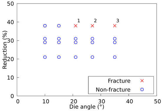 Cho et al. [16,17] conducted an extensive evaluation of various ductile fracture criteria to predict material failure in the cold drawing process of high-alloy steel. By integrating six different fracture models into finite element analysis, 2D maps were generated to delineate critical zones where fractures are likely to occur based on die semi-angle and reduction ratios. The findings demonstrated that criteria incorporating stress triaxiality and maximum principal stress, such as the Ko et al. [18] criterion, provided higher prediction accuracy, especially in challenging drawing conditions with higher reduction ratios and die angles. Expanding on their previous research, Cho et al. [19] introduced a Process Condition Diagram (PCD) that maps critical zones in the bar drawing process, particularly highlighting conditions that lead to microdefects and fractures. By applying multiple damage models and validating their predictions through finite element analysis, the study confirmed that the Ko criterion, which considers stress triaxiality and maximum principal stress, provided the most accurate predictions for high-alloy steel.