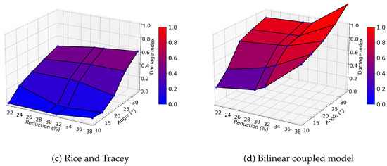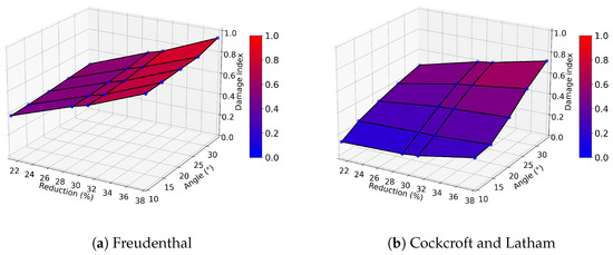 Damage Index: Since each approach or damage model has distinct damage functions, a comparison is proposed using a dimensionless parameter known as the damage index (Equation (10)). This index is defined as the ratio between the damage reached (d) and the critical damage ( d c , which corresponds to the damage value at the moment of fracture) regardless of whether a coupled or uncoupled approach is used. Introducing this index allows for easier and more direct comparisons between different models and approaches. Consequently, when the damage index equals 1, the fracture condition is predicted by the model.