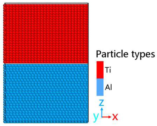 Ti/Al layered composites were modeled using Atomsk; Ti/Al layered composites were modeled to include mainly single-crystal-oriented Ti and Al. At room temperature, pure titanium had a hexagonal close-packed (HCP) lattice structure with a space group of P63/mmc and lattice constants of a = 2.95 Å and c = 4.68 Å. [15] Al had a face centered cubic lattice with a lattice constant of a = 4.05 Å. The Ti/Al layered composite model is shown in Figure 1. The x-axis, y-axis, and z-axis of the Al layer corresponded to the [] [] and [111] crystal directions. The x-axis, y-axis, and z-axis of the Ti layer corresponded to [] [] and [0001]. The model size was 79.65 Å (x) × 40.8764 Å (y) × 113.24784 Å (z), with a total of 20,736 atoms. The size of the Ti model was 79.65 Å (x) × 40.8764 Å × 57.12944 Å (z). The size of the Al model was 79.65 Å (x) × 40.8764 Å × 56.1184 Å (z). The initial volume fraction of Ti was set as 50%.