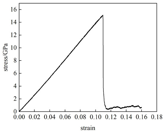 Figure 2 shows the stress–strain curve of the Ti/Al layered composite under compressive deformation in the z-axis direction at 300 K. At the beginning of the deformation, the compressive stress of the Ti/Al layered composite increases almost linearly with the increase in strain, i.e., elastic deformation. When the strain increases to 0.11, the tensile stress reaches its maximum threshold (~15.16 GPa); thereafter, it decreases sharply and the model enters into the plastic deformation stage.