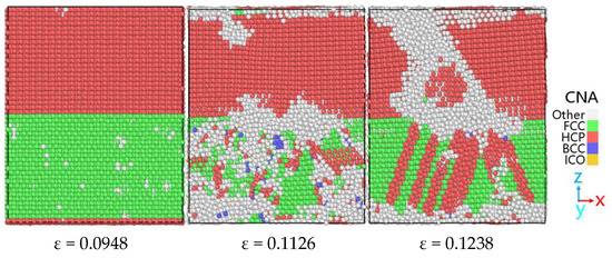 The compressive evolution of the atomic structure of Ti/Al layered composites at 300 K is shown in Figure 3, which is colored according to the common nearest neighbor atomic analysis [19]. At the beginning of the compression deformation, both Ti and Al layers are in the elastic deformation stage, and the lattice size is changed, but the crystal structure remains unchanged. At this stage, the atoms of the Ti/Al laminate composite are well aligned and no dislocations are generated. When the strain increases further, local disordered atoms appear in the Al layer. Afterwards, the disordered atoms aggregate under stress and plastic deformation occurs, with the initial plastic deformation taking the lead on the Al side. With the increase in strain, the plastic deformation starts to cross the interface from the Al side to the Ti side, and slip dislocations start to appear gradually on the Ti side.