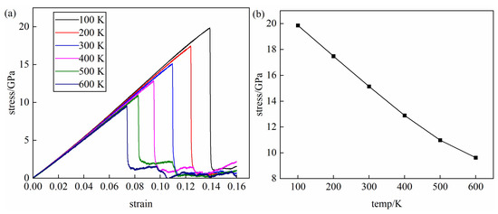 The compressive properties of the sample under six different temperatures, including 100, 200, 300, 400, 500, and 600 K, are examined. Figure 5a shows the compressive stress–strain curves of Ti/Al layered composites at different temperatures. In general, the stress–strain curves share a similar profile, while significant differences in yield strength and yield strain are detected. The elastic modulus of the compressive deformation behavior of Ti/Al layered composites at the early stage of compressive deformation increases gradually with decreasing temperature, suggesting that the temperature also impacts the elastic deformation of the model. Such observation aligns with previous works on other nanomaterials, i.e., the higher the temperature, the lower the modulus [23,24]. According to Figure 5b, the sample has a yield strength of 17.48 GPa with a yield strain of 0.12 at 200 K. The yield strength decreases almost linearly with the increase in temperature. However, the reduction rate of compressive strength decreases above the 400 K temperature.