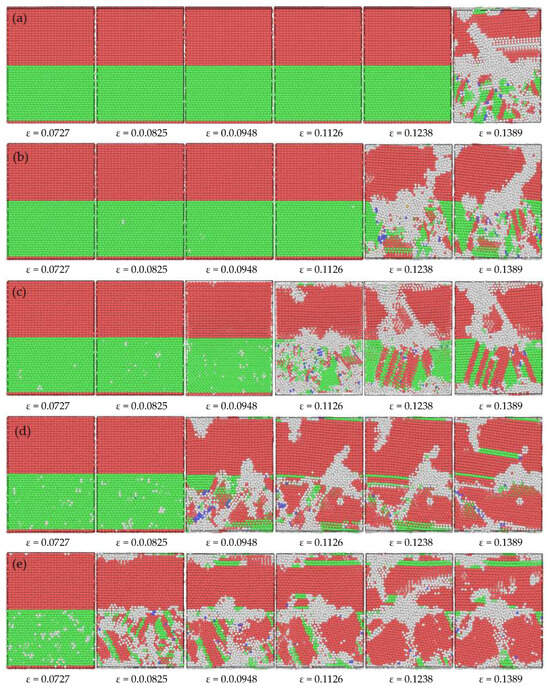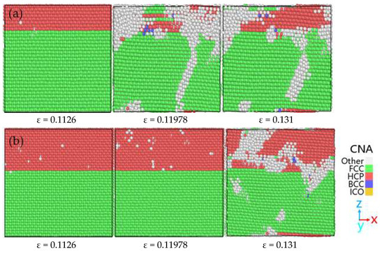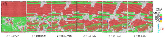Figure 8 shows the atomic structure evolution of Ti/Al layered composites with different Ti volume fractions. It is found that the initial plastic deformation and dislocations of Ti/Al layered composites with Ti volume fractions of 25% and 40% are mainly concentrated on the Ti side after reaching the compressive strength. Figure 3 shows that the initial dislocations and plastic deformation of Ti/Al layered composites with a Ti volume fraction of 50% are mainly concentrated on the Al side. These observations explain different stress–strain curves shown in Figure 7a. Under the applied stress, the deformation of Ti/Al layered composites is always smaller than that of the Al side as Ti has a higher modulus [29,30]. As such, the Al side will exhibit more plastic deformation than the Ti side. However, when the Ti side is too thin, more plastic deformation will be triggered in order to accommodate the strain energy [31]. The interplay between the strain energy and the thickness of the Ti or Al region results in the observation that although the compressive strength of Ti/Al layered composites increases with a higher Ti volume fraction, the sample may exhibit smaller yield strain.