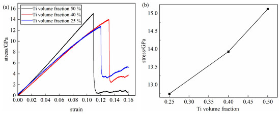 The compressive stress–strain curves of Ti/Al layered composites with different Ti volume fractions are shown in Figure 7a. It is seen that the Ti/Al layered composite with a Ti volume fraction of 25% reaches a compressive strength of 12.75 GPa at the strain ε = 0.12. The Ti/Al layered composite arrives at a compressive strength of 14.08 GPa at the strain ε = 0.13 when the Ti volume fraction is 40%. The Ti/Al laminate composite with a Ti volume fraction of 50% reaches a compressive strength of 15.14 GPa at the strain ε = 0.11. Figure 7b shows the compressive strength versus Ti volume fraction curves for Ti/Al layered composites.