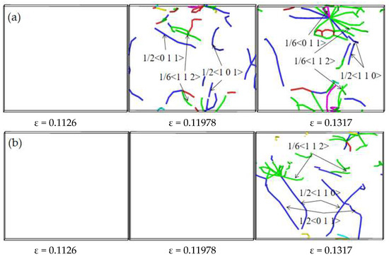 To reveal the changes in the type of dislocations occurring in the compressive deformation of Ti/Al layered composites, the dislocation extraction function [20] in the visualization software OVITO is used for the analysis. The evolution of the type of dislocations produced during compression is shown in Figure 4. It is found that 1/6<211> and 1/6<112> dislocations are generated during compression. The dislocations are concentrated on the Al side initially, and the 1/2<101> and 1/6<211> dislocations cross the interface from the Al side to the Ti side.
