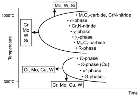 Heat treatment of duplex stainless steels (DSSs) and super duplex stainless steels (SDSSs) at temperatures ranging from 320 to 950 °C can lead to property degradation due to the precipitation of brittle intermetallic phases, such as the sigma phase, chi phase, M23C6 carbide, or M2N nitride (Figure 1) [18]. Research indicates that the sigma phase is particularly detrimental, as it adversely affects both weld toughness and corrosion resistance [12,13,19,20,21,22,23,24,25].
