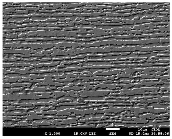 The current investigations utilized 2 mm-thick sheets made from commercially available super-duplex stainless steel SAF 2507 (Sverdrup Steel AS, Stavanger, Norway). The chemical composition of the experimental steel is detailed in Table 1 (material sheets sourced from the supplier). The material supplier also provided the thermo-physical and minimum guaranteed mechanical properties in accordance with the relevant ASTM standards. The as-received sheets contained approximately equal contents of ferrite and austenite (Figure 2) (material sheets the supplier).