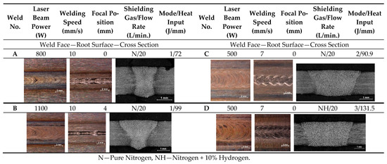 Weld face, root face, and cross section of joints produced with laser beam welding with different parameters (Samples (A–D)).