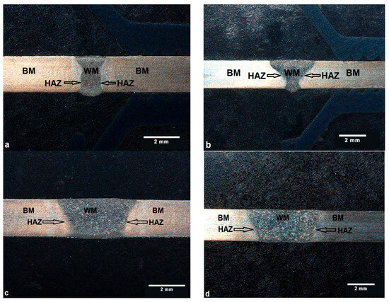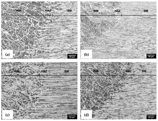 Microstructure of the LB experimental weld joints—WM, HAZ, and BM: (a) Sample A, (b) Sample B, (c) Sample C, (d) Sample D.